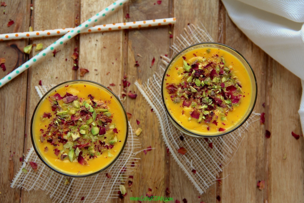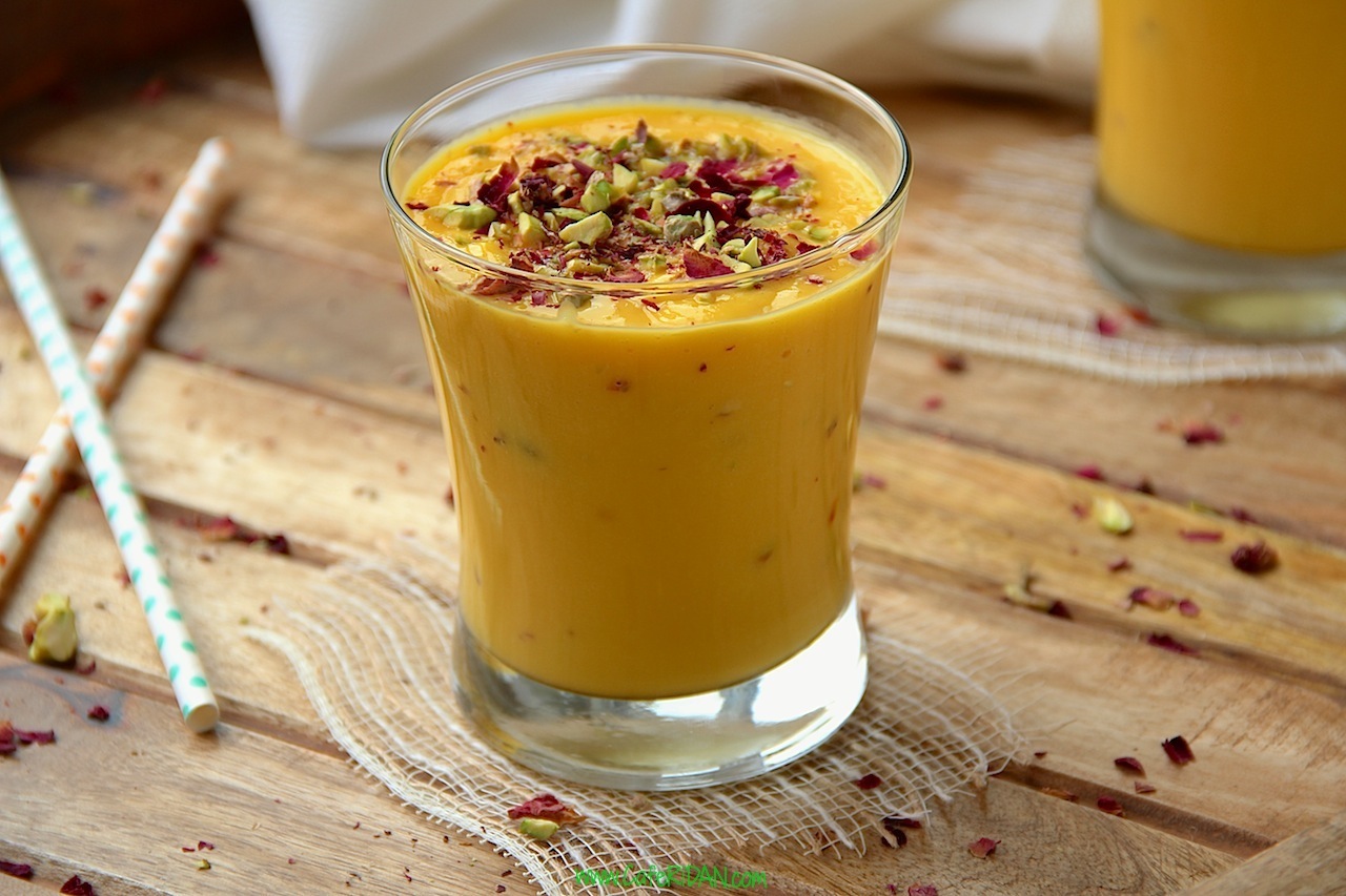 This mango lassi is like drinking a dessert that is really good for you. The blend of fresh mangoes, mango pulp, yogurt and milk makes a delicious, sweet and creamy smoothie. An addition of saffron, rose water and kewra essence give it a distinct Indian flavor. I top my lassi with chopped pistachios that adds a slight crunch and flavor in every sip. Mango lassi tastes best chilled. I like to put my mango lassi in the refrigerator for an hour before I serve it. This also allows the flavors to blend.