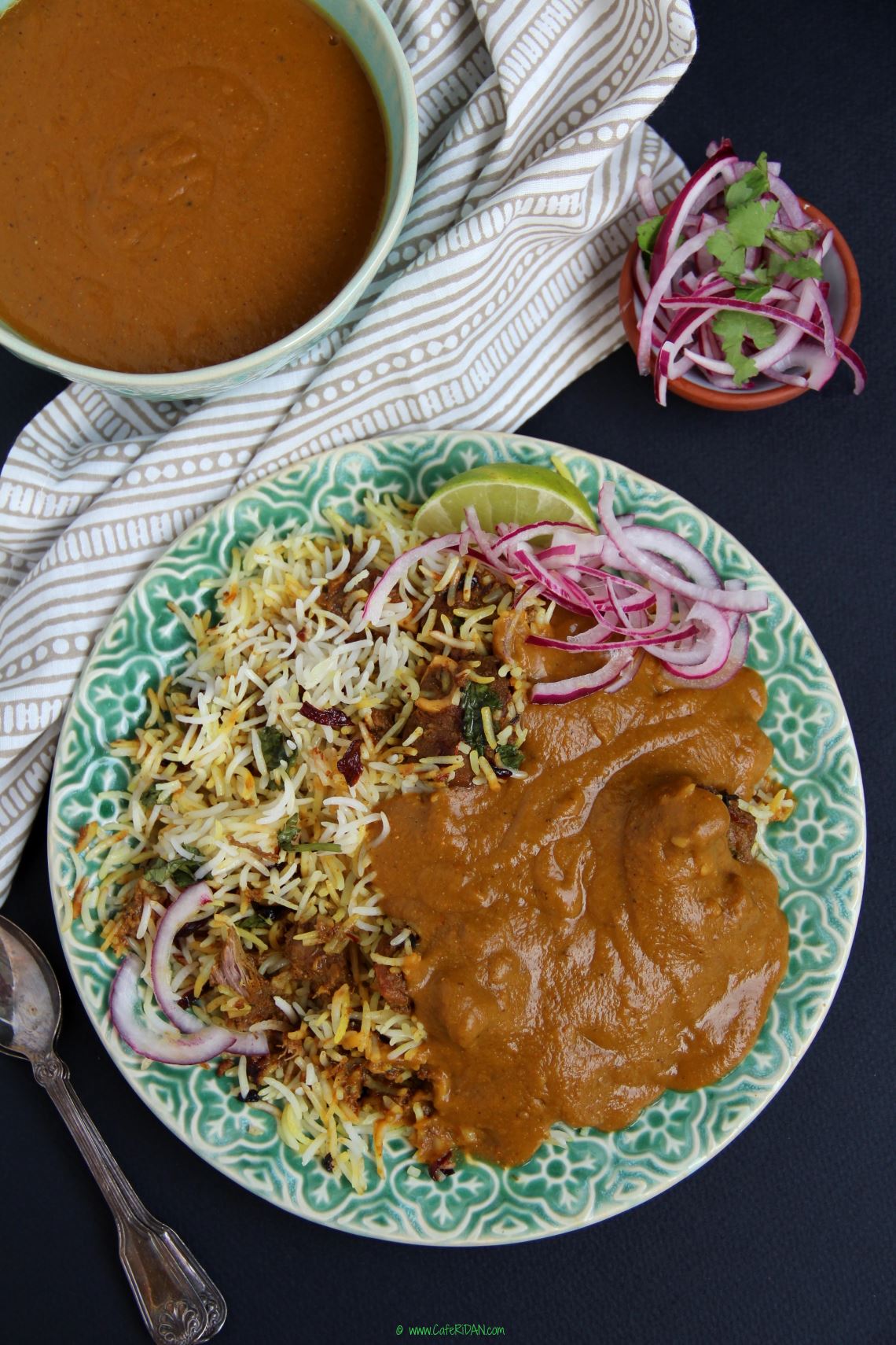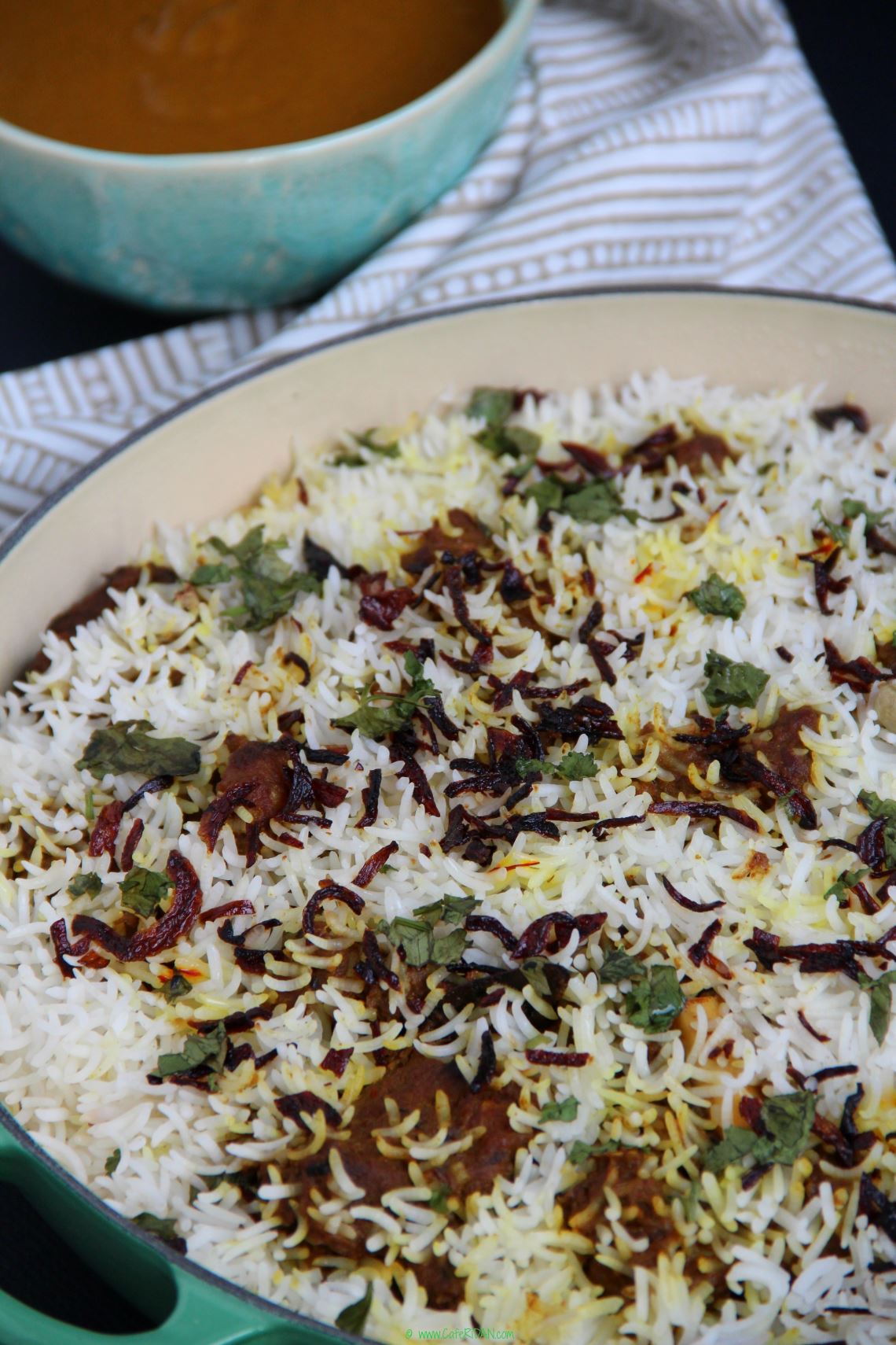 Layer a third of the rice at the bottom of the dish. Sprinkle a little saffron milk, ghee, cilantro and fried onions over the rice. Then gently layer half the mutton over the rice. Add another layer of rice with saffron milk, ghee, cilantro and fried onions, then the rest of the mutton and then the final layer of rice with saffron milk, ghee, cilantro and fried onions.